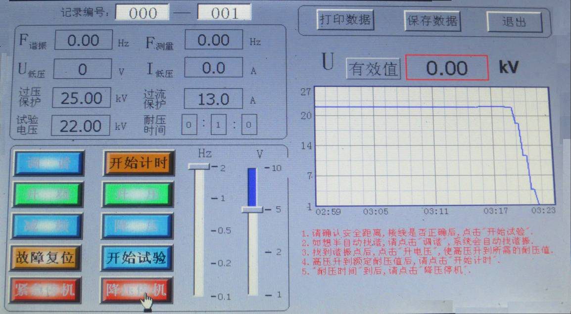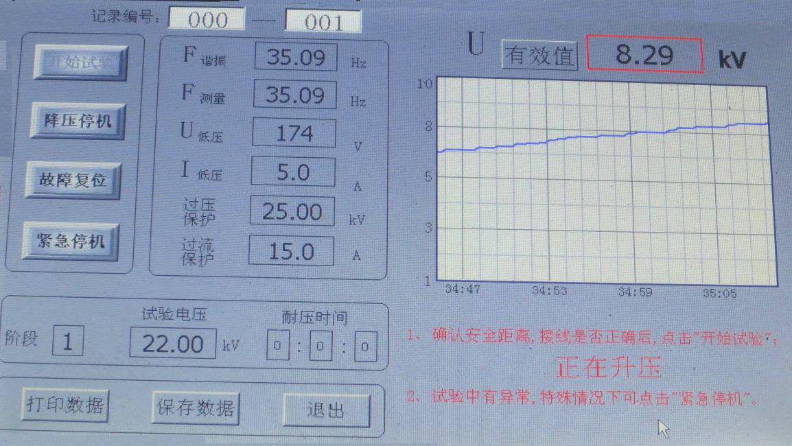 點擊“開始試驗”,系統自動尋找諧振點,右下角提示“正在調諧,如有異常情況,請點擊“降壓停機””;藍代表電壓曲線,顯示界面如圖所示